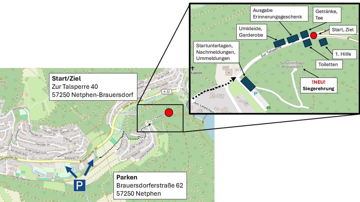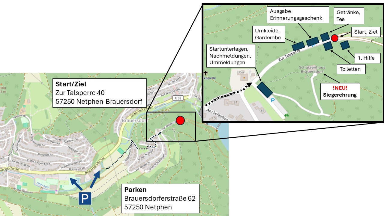 Ab 13:00 Uhr wird die Siegerehrung aller Läufe im Schützenhaus Brauersdorf oberhalb des Start-/Zielbereichs durchgeführt. Für Kaffee, Kuchen und Getränke ist gesorgt.